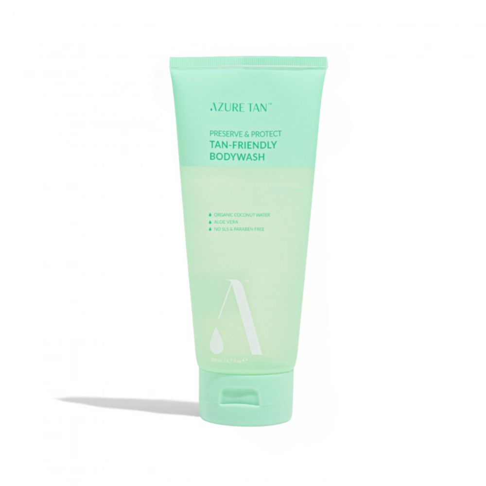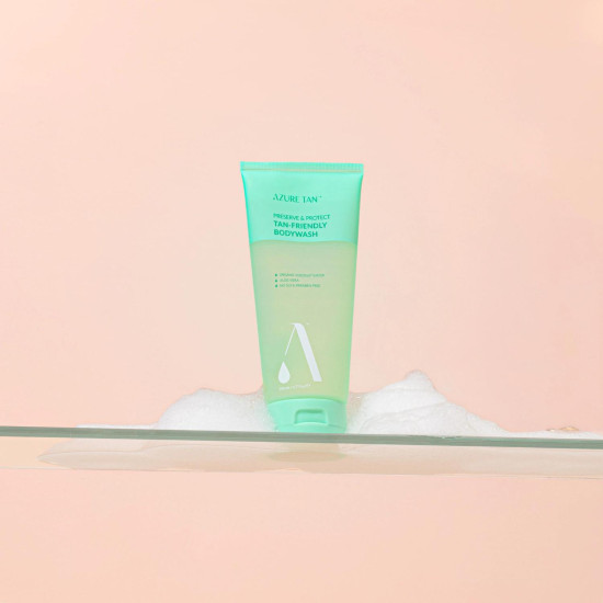 De Azure Tan Preserve & Protect Tan-Friendly Bodywash biedt een alles-in-één oplossing voor het reinigen én behouden van je tan, met aandacht voor huidgezondheid en hydratatie.