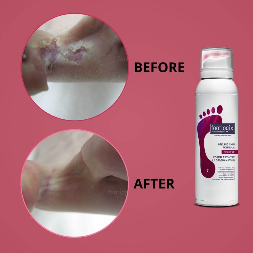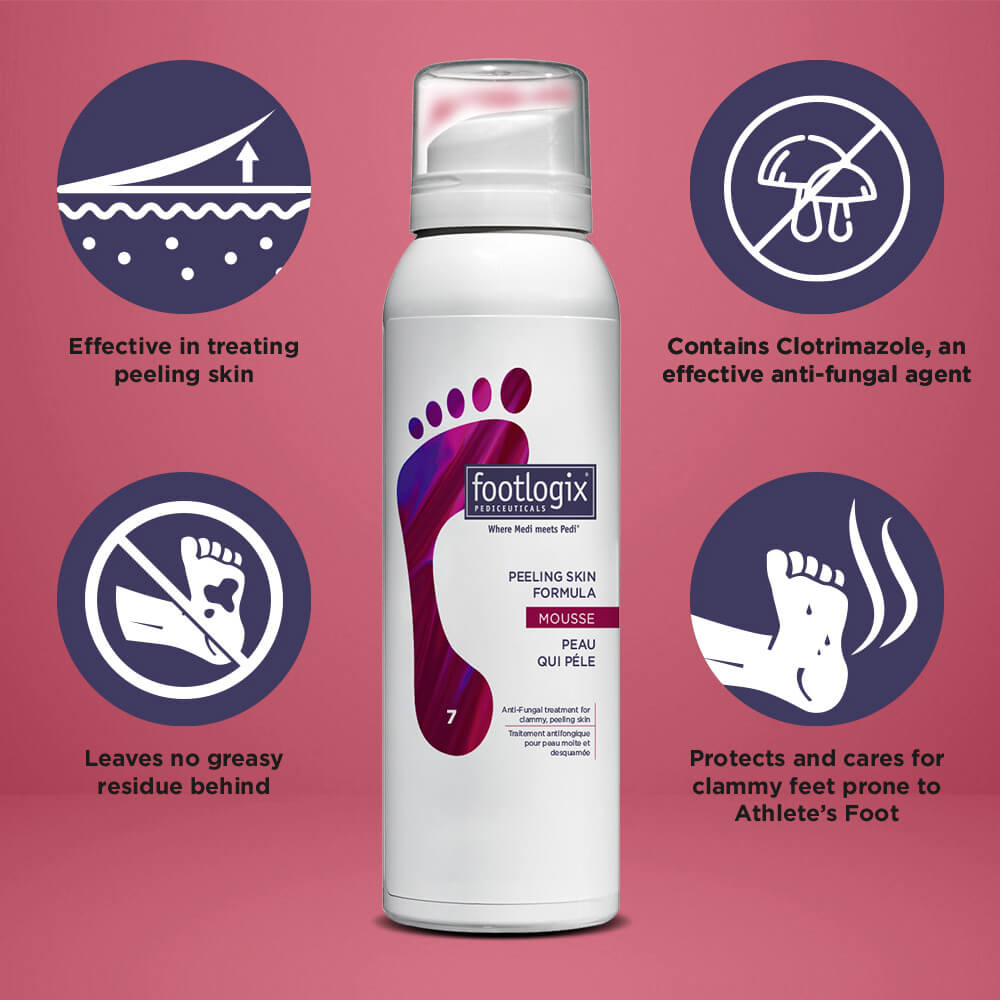 De Footlogix Peeling Skin Formula met Dermal Infusion Technology® bevat een krachtige, schimmelwerende werkstof die de schilferige huid op de voetzolen aanpakt en jeuk tussen de tenen verlicht, veroorzaakt door voetschimmel (atletenvoet). Deze bewezen formule verzorgt, beschermt en ondersteunt het herstel van een klamme, gevoelige huid. De niet-occlusieve mousse wordt onmiddellijk door de huid opgenomen en laat geen vettig laagje achter. Hierdoor is het na aanbrengen direct mogelijk om schoenen te dragen.
