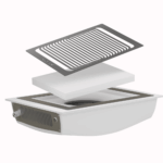 - De vorm van het rooster is vierkant. Hierdoor is het stof oppervlak groter dan bij een rond filter. Het rooster zit d.m.v. magneten vast. Door het rooster los te halen kom je gemakkelijk bij het filter. Het gat in de tafel is 26cm x 19cm.
